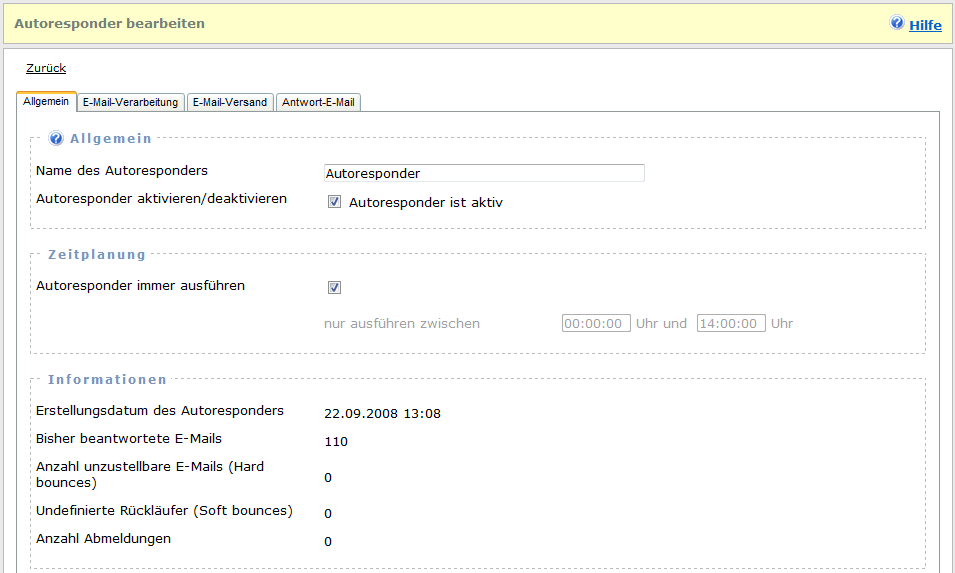 | Informationen | Zeigt Informationen zum Autoresponder.
