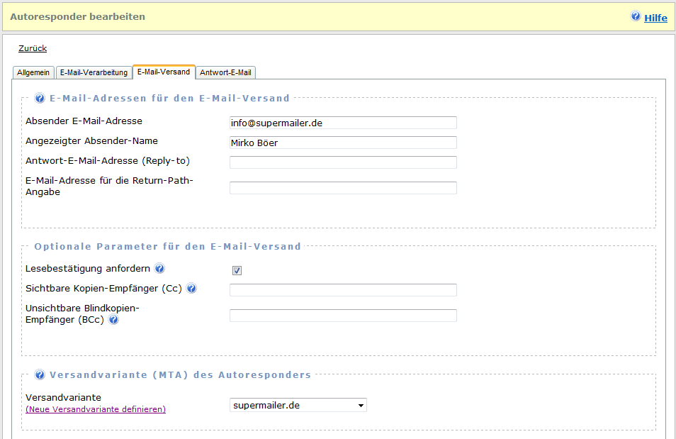 | Versandvarianten (MTA = Mail Transfer Agent) des Autoresponders | Wählen Sie die Versandvariante, welche für den Versand der