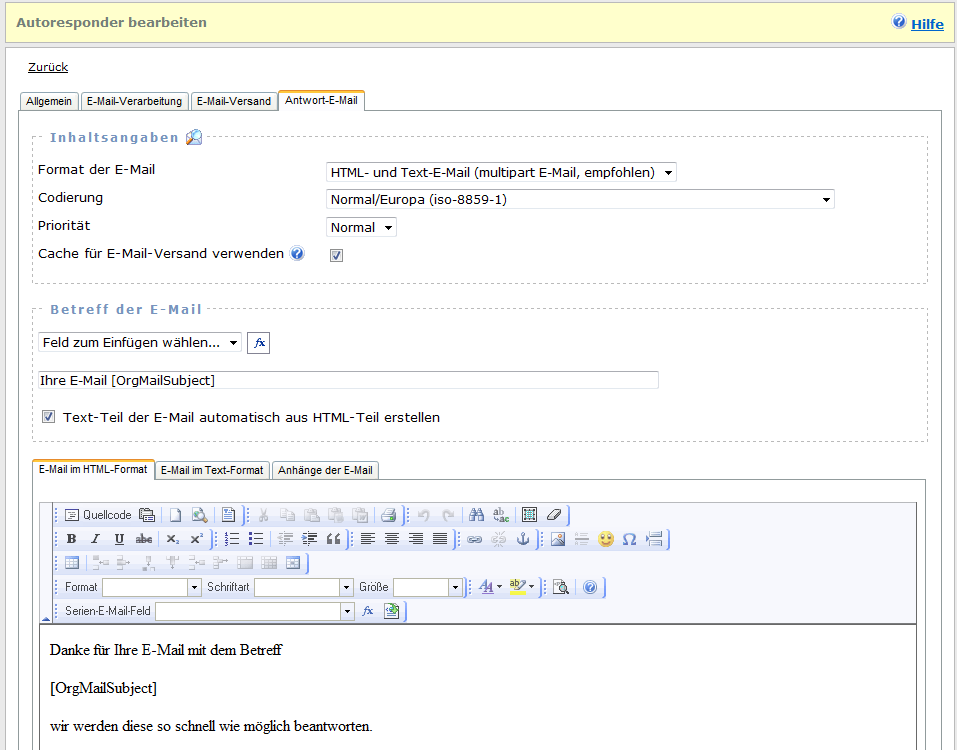 | Autoresponder aktivieren/deaktivieren | Setzen Sie das Häkchen um den Autoresponder zu aktivieren,
